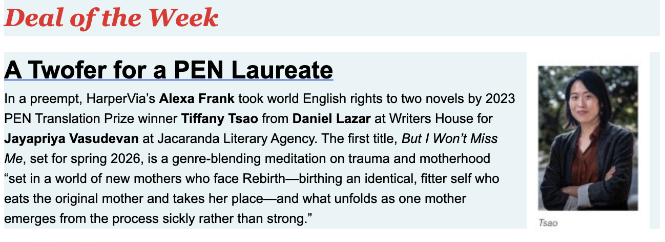"In a preempt, HarperVia's Alexa Frank took world English rights to two novels by 2023 PEN Translation Prize winner TIffany Tsao from Daniel Lazar at WRiters House for Jayarpiya Vasudevan at Jacaranda Literary Agency. The first title, But Won't I Miss Me, set for spring 2026, is a genre-blending meditation on trauma and motherhood "set in a world of new mothers who face Rebirth – birthing an identical, fitter self who eats the original mother and takes her place – and what unfolds as one mother emerges from the process sickly rather than strong."